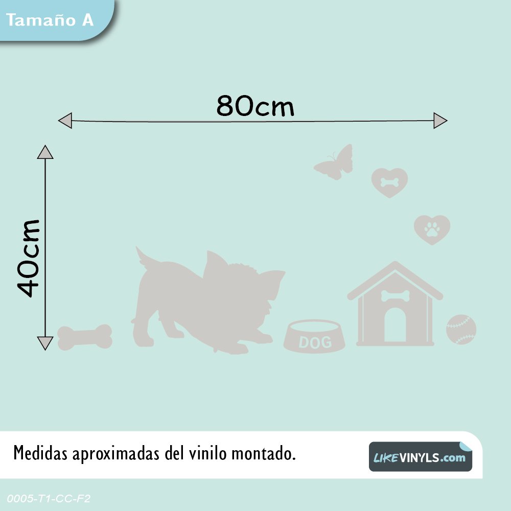 Elementos incluidos: Silueta de un perro pequeño, caseta con hueso, cuenco de comida con la palabra “DOG”, pelota, huesos sueltos, corazones con huellas y una mariposa.